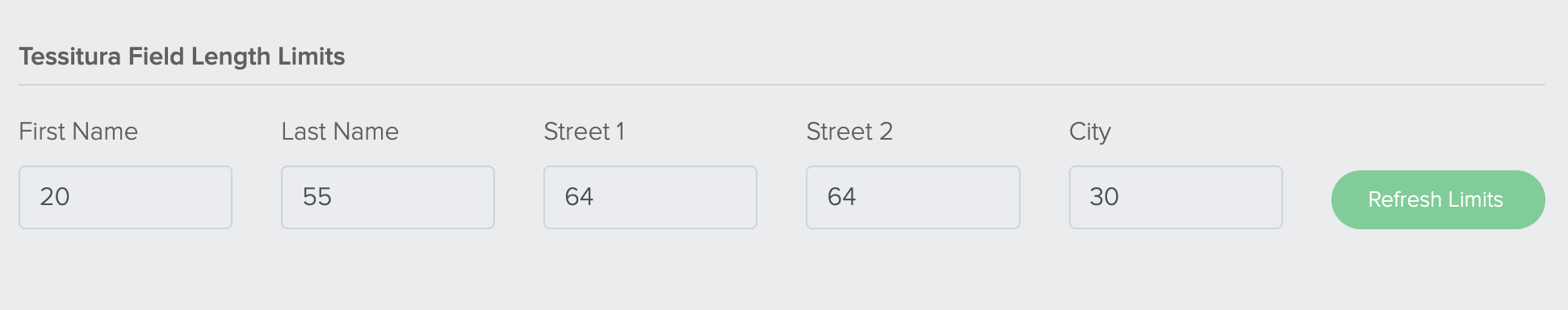 We automatically query your Tessitura settings through the API for First & Last Name, Street 1, Street 2, and City length values.